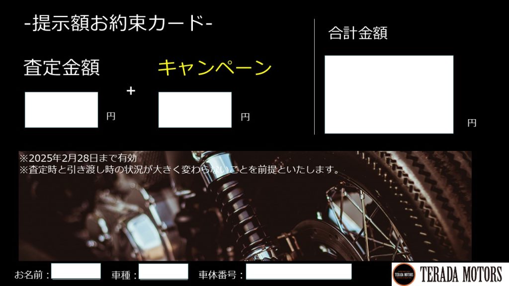 査定後には1月末まで有効期限の今回、査定をさせていただいた提示額と同様の金額をお約束する【提示額お約束カード】をお渡しさせていただきます。